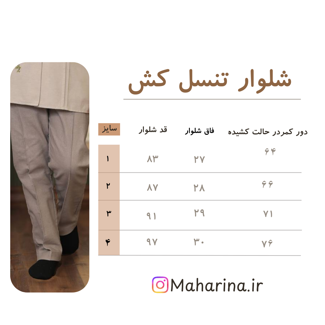 جزئیات: پشت شلوار کش میخورد و اندازه دور کمر درحالت کشیده در نظر گرفته شود